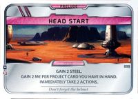 In the 2400s, mankind begins to terraform the planet Mars. Giant corporations, sponsored by the World Government on Earth, initiate huge projects to raise the temperature, the oxygen level, and the ocean coverage until the environment is habitable. In Terraforming Mars, you play one of those corporations and work together in the terraforming process, but compete for getting victory points that are awarded not only for your contribution to the terraforming, but also for advancing human infrastructure throughout the solar system, and doing other commendable things. As a player, you acquire unique project cards (from over two hundred different ones) by buying them to your hand. The cards can give you immediate bonuses, as well as increasing your production of different resources. Many cards also have requirements and they become playable when the temperature, oxygen, or ocean coverage increases enough. Buying cards is costly, so there is a balance between buying cards and actually playing them. Standard Projects are always available to complement your hand of cards. Your basic income, as well as your basic score, are based on your Terraform Rating. However, your income is boosted by your production, and VPs are also gained from many other sources. You keep track of your production and resources on your player board. The game uses six types of resources: MegaCredits, Steel, Titanium, Plants, Energy, and Heat. On the game board, you compete for the best places for your city tiles, ocean tiles, and greenery tiles. You also compete for different Milestones and Awards worth many VPs. Each round is called a generation and consists of the following phases: 1) Player order shifts clockwise. 2) Research phase: All players buy cards from four privately drawn. 3) Action phase: Players take turns doing 1-2 actions from these options: Playing a card, claiming a Milestone, funding an Award, using a Standard project, converting plant into greenery tiles (and raising oxygen), converting heat into a temperature raise, and using the action of a card in play. The turn continues around the table (sometimes several laps) until all players have passed. 4) Production phase: Players get resources according to their terraform rating and production parameters. When the three global parameters (temperature, oxygen, ocean) have all reached their required levels, the terraforming is complete, and the game ends after that generation. Combine your Terraform Rating and other VPs to determine the winning corporation!