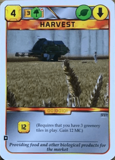 Fall Season Promo 2021 of FryxGames, which you can buy on its own, or get for free if you order a certain amount at their webstore. Harvest It's a red card with a cost of 4 M€. It has a plant- and event-tag. Requirements: 3 greenery tiles Effect: Gain 12 M€ Promo card X37
