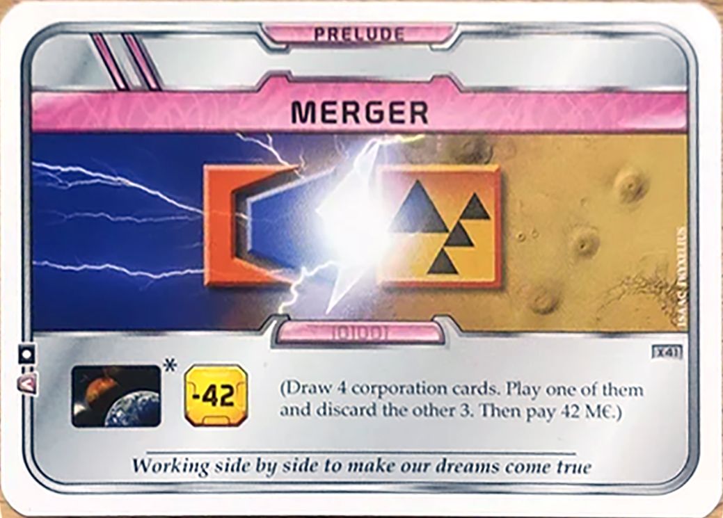 This is the summer 2022 promo card. Merger is a Prelude card that lets you draw 4 Corporations, play one of them and discard the other 3. Then you pay 42 M€. Promo card X41 So you get a second Corporation.