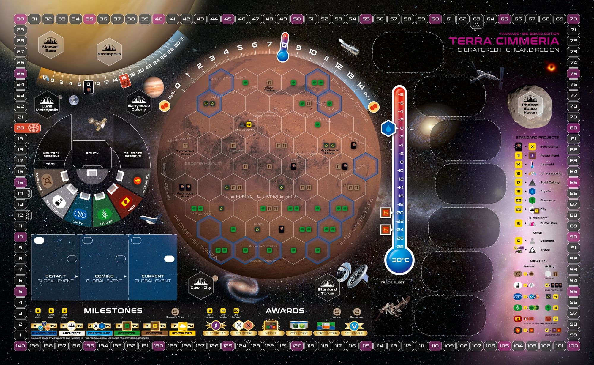Terra Cimmeria is a new fan-made board for Terraforming Mars, with new milestones and awards: Special rules Place a tile on MSL Curiosity area and get a colony for just 5 M€. Milestones Planetologist - achieve 5 planet tags (Earth, Jovian, Venus) Architect - have 3 city tags Coastguard - have 4 tiles adjacent to ocean tiles Forester - have 5 plant production Investor - have 13 MC production (Replaced with Fundraiser 12 M€ production, in the commercially-published version) Hoverlord - have 7 floater resources Awards Electrician - most power tags Founder - most tiles adjacent to special tiles Mogul - most production except M€ Zoologist - most animal/microbe resources Forecaster - most blue/green cards with requirements